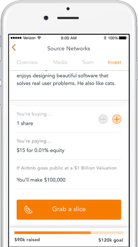 We make investing in startups easy for you. Just browse startups, select the number of shares you’d like to buy, and grab a slice.
